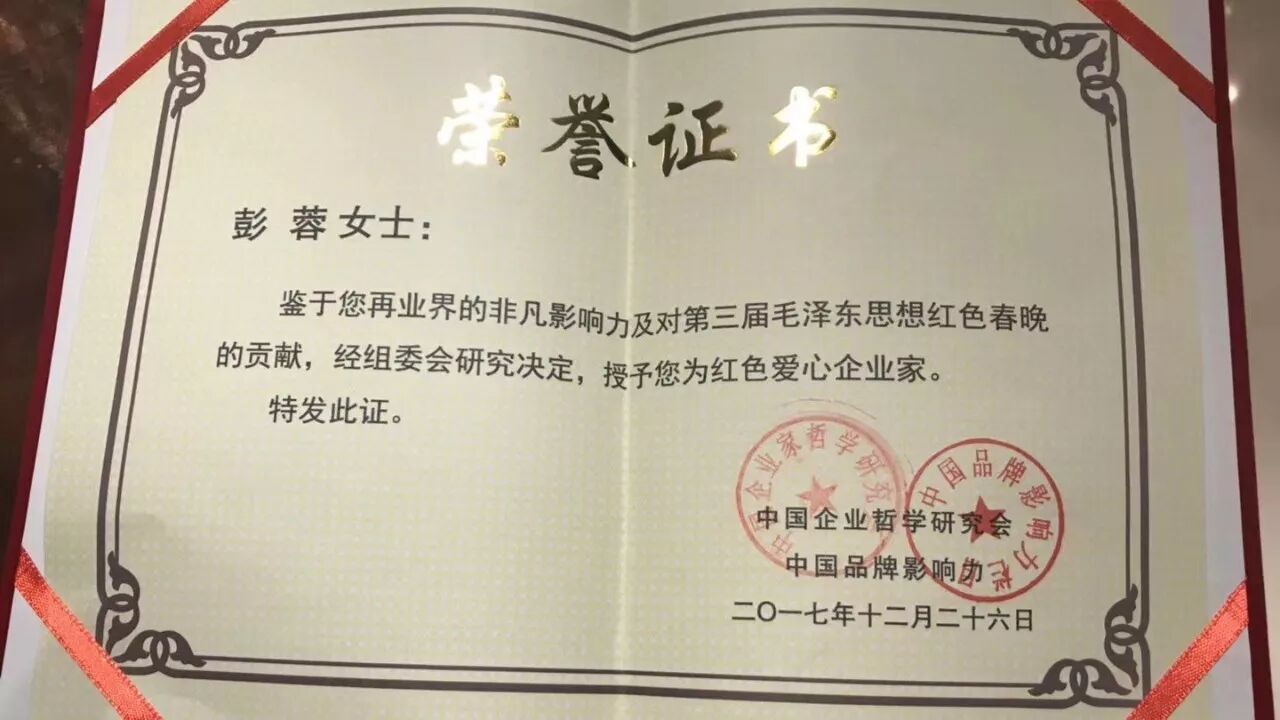 慈善之举无关乎成功与否,在任何的阶段都可以做慈善帮助需要帮助的人。本次晚会同时举办了慈善捐赠,彭董有幸获得红色爱心企业家荣誉证书。